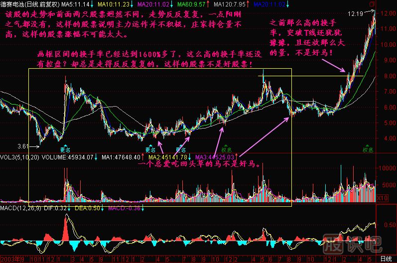 小結:一只好的股票,在大盤(pán)開(kāi)始上漲之后,它應該表現為好馬不吃回頭草,只有這樣的股票才說(shuō)明莊家建倉積極,每突破一條防線(xiàn)之后,莊家就舍不得再讓股價(jià)回到該防線(xiàn)之下了,如果能夠回下來(lái),就意味著(zhù)莊家愿意讓散戶(hù)來(lái)逢低吸納,這就從一個(gè)側面說(shuō)明幾個(gè)問(wèn)題,起碼說(shuō)明莊家決心不夠強,或者說(shuō)明莊家的資金實(shí)力有限,還可能是該股基本面有某種不確定性,使得莊家比較猶豫,還可能是多個(gè)主力在對弈,這樣的股票就不可能是好股票!