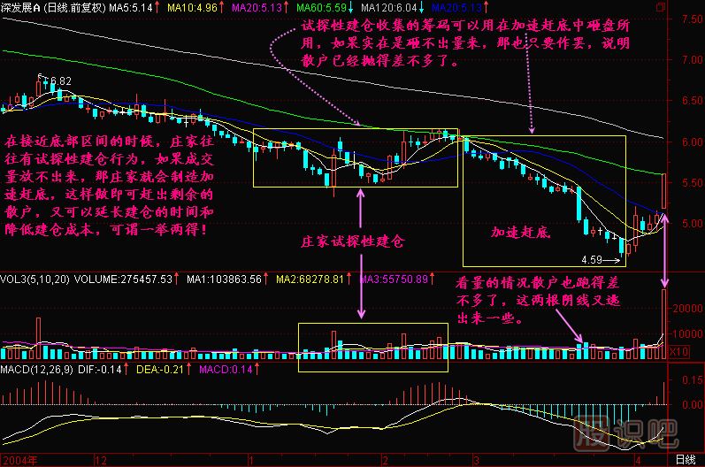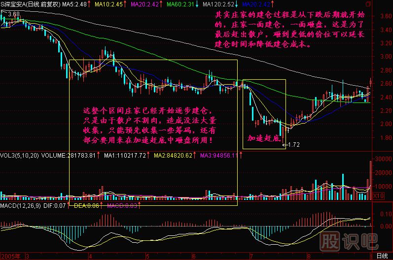小結:加速趕底是莊家建倉常用的招數,莊家預先收集一點(diǎn)籌碼,之后可以用部分籌碼來(lái)砸盤(pán),制造加速趕底的走勢,加速趕底之前往往有一個(gè)小平臺橫盤(pán),散戶(hù)原本還打算持股觀(guān)望的,但突然向下快速突破,散戶(hù)終于在最后的恐慌中拋出了籌碼。