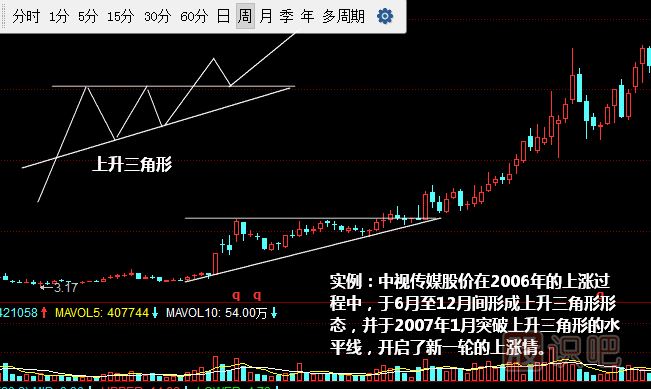 上升三角形形態(tài)K線(xiàn)圖圖解實(shí)例:中視傳媒股價(jià)在2006年的上漲過(guò)程中,于6月至12...