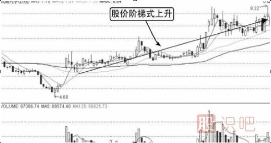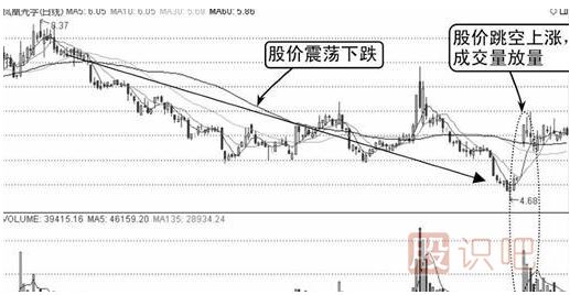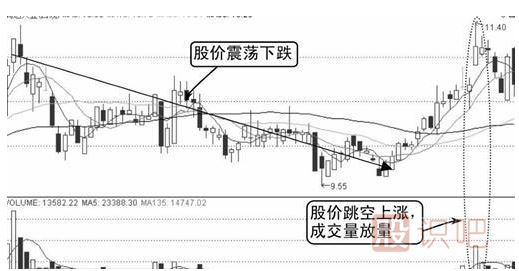 由圖中可知,股價(jià)從高位震蕩下跌,成交量此時(shí)并未放大,而是保持地量水平,說(shuō)明股價(jià)下跌沒(méi)有多少接盤(pán),市場(chǎng)普遍不看多。股價(jià)兩次成功探底后開(kāi)始展開(kāi)拉升的行情,到達一定高度后出現跳空上漲,成交量放大,如下圖所示。