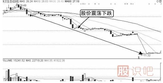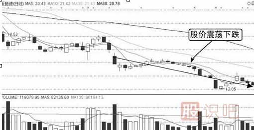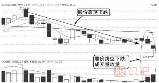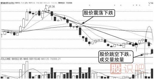 由圖中可知,該股股價(jià)從29.49元頂部開(kāi)始一路下跌,股價(jià)下跌到一定幅度后開(kāi)始進(jìn)行橫盤(pán),成交量有所萎縮。隨后股價(jià)跳空下跌并伴隨放量,如下圖所示。