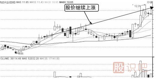 由圖中可知,該股前期下跌后跌入一個(gè)V形底中,隨后不久股價(jià)跳空漲停,顯示拉升有力,再加上伴隨而來(lái)的成交量放大,是莊家拉抬股價(jià)的表現。莊家制造跳空漲停來(lái)吸引投資者的關(guān)注,后市股價(jià)漲幅巨大,此時(shí)投資者在跳空后介入利潤會(huì )頗豐。
