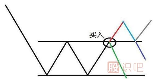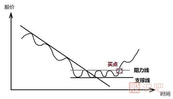 2、當一個(gè)股票在下跌趨勢中,完成一次的震蕩之后,拒絕新低的出現,并再次向上(而被突破)時(shí),此時(shí)意味著(zhù)空頭力量衰減,市場(chǎng)暫時(shí)均衡,但此時(shí)并不需要急于買(mǎi)入,以防震蕩后繼續重歸下跌趨勢
