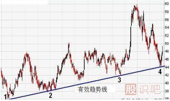 下面這只股票的圖表顯示已經(jīng)觸及4次的上升趨勢線(xiàn)。在的第三次觸摸之后,趨勢線(xiàn)被認為是有效的支持線(xiàn)?,F在股價(jià)已經(jīng)第四次反彈,支持水平的穩健性進(jìn)一步提升。只要股價(jià)維持在趨勢線(xiàn)(支撐位)之上,趨勢仍將控制多頭。如果下跌,則表明凈供應量正在增加,趨勢的變化可能即將發(fā)生。