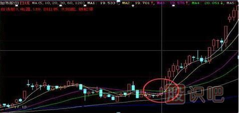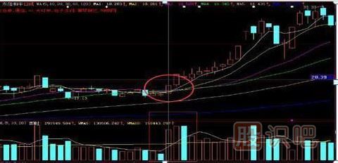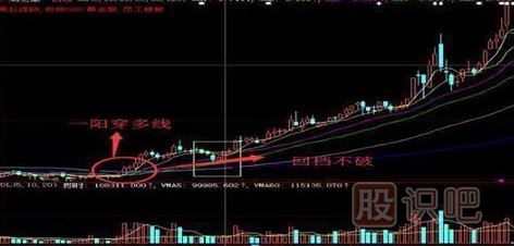 一根大的陽(yáng)線(xiàn)上穿三條至四條均線(xiàn),改變均線(xiàn)為多頭排列,特別是在均線(xiàn)粘合處的一陽(yáng)穿多線(xiàn),如果有量能配合,代表盤(pán)整結束即將拉升的啟動(dòng)點(diǎn)。