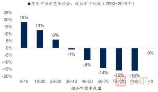 統計分析顯示,長(cháng)期來(lái)看,低估值策略有明顯的超額收益。市盈率在10倍以下(不含虧算市盈率為負股票)組合的收益率中位數高達18%,遠遠領(lǐng)先其他各個(gè)市盈率范圍組合的收益率中位數,而且可以發(fā)現,組合收益率的中位數與組合市盈率高低呈現出非常強烈的負向關(guān)系,即組合的市盈率越低收益率越高。