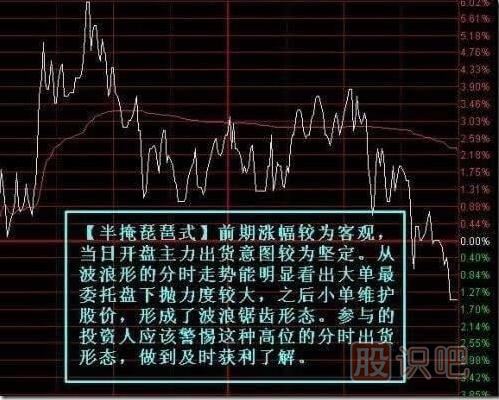 圖例七:【半掩琵琶式】此種形態(tài)較為常見(jiàn),主力大多在運作后期采用,股價(jià)已經(jīng)略有漲幅或者立桿拉升??梢?a href=http://www.mztkc.com/jsfx/pk/ target=_blank class=infotextkey>盤(pán)口情況加以分辨,顯示拋壓較大且有維護,和打壓洗盤(pán)的區別在于主力是想假意把股價(jià)往上做,但統觀(guān)大局卻屬逐漸下降態(tài)勢,而打壓洗盤(pán)大多不會(huì )刻意維護股價(jià),給人泰山壓頂態(tài)勢。仔細辨別。