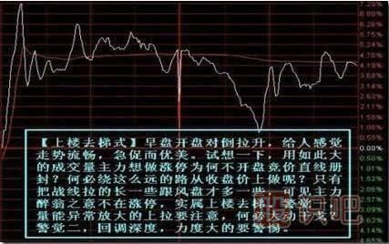 圖例三:【上樓去梯式】此種形態(tài)盤(pán)中較為常見(jiàn),出現在主力短線(xiàn)高拋低吸走勢中較多,短期有一定風(fēng)險,如成交量和換手率沒(méi)有成倍放大,對大勢運行并無(wú)太大影響。只是在個(gè)股走出如此形態(tài)的時(shí)候介入需小心短期風(fēng)險,持有需醒悟獲利了結。