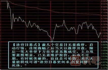 圖例四:【途窮日暮式】此種形態(tài)對于盤(pán)感不佳或者手法遲鈍的投資者有一定殺傷力,稍微遲疑帳戶(hù)縮水明顯;對于觀(guān)望者沒(méi)有多大影響,如此大幅下挫誰(shuí)還能跟進(jìn)?對于持有籌碼投資者可在早盤(pán)開(kāi)盤(pán)填好單子以備不時(shí)之需。養成習慣。