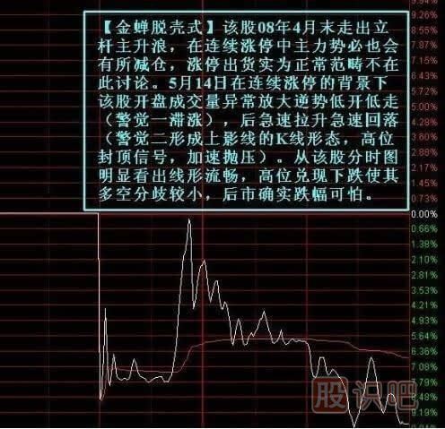 圖例二:【金蟬脫殼式】該形態(tài)大多出現股價(jià)直線(xiàn)上漲之后,所以基本在此之前很多投資者要么被洗出局,要么止盈離場(chǎng),所以基本無(wú)太大殺傷力。只是知道在大漲之后離大跌就不遠了,所以連續漲停個(gè)股進(jìn)入有風(fēng)險,追漲需謹慎。一旦一時(shí)心血來(lái)潮進(jìn)入,走出如此形態(tài)即需回避離場(chǎng)。判斷一只個(gè)股是否脫殼其實(shí)成交量已經(jīng)不大管用,這種短期爆炒個(gè)股均放大成交量主要可觀(guān)察分時(shí)中回調的力度和空間,不能一概而論。