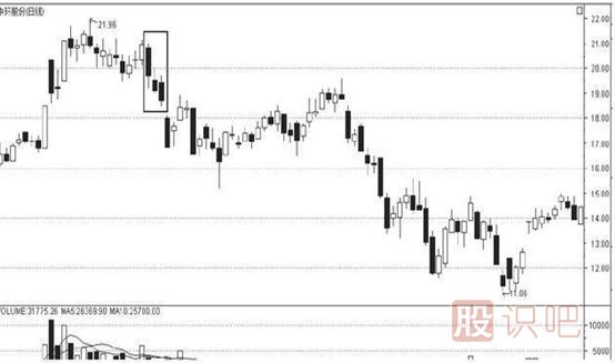 二、頂部現陰線(xiàn)反轉所謂頂部現陰線(xiàn)反轉,俗稱(chēng)為黃昏之星,是由三根K線(xiàn)組成的一種意味著(zhù)上升趨勢中止的K線(xiàn)形態(tài)。