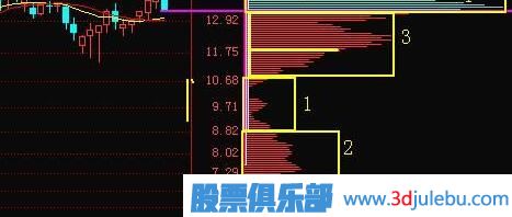 如 圖。我們先熟悉一下籌碼分布的基本概念。K線(xiàn)圖右側的這個(gè)像是橫著(zhù)放倒的山峰形狀的指標圖形就是籌碼分布。它其實(shí)是由與價(jià)格橫向對應的一條條橫線(xiàn)組成,而這些橫線(xiàn)的長(cháng)短,就代表著(zhù)有多少持倉成本為該價(jià)格位置的股份數量存在,根據所有股份(流通盤(pán))的持倉成本擺放在相對應的價(jià)格橫線(xiàn)上,就得到了這樣的一個(gè)圖 形。