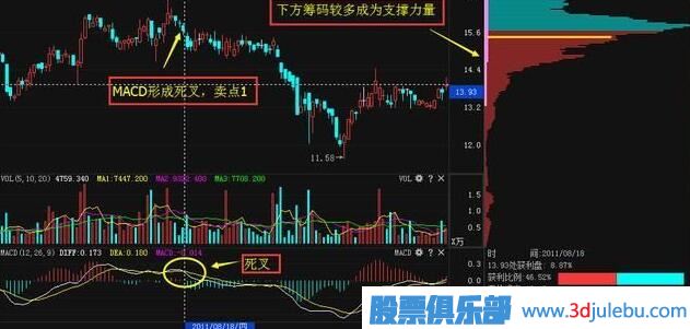 表明市場(chǎng)下跌的動(dòng)能已經(jīng)暫時(shí)占據優(yōu)勢,但其籌碼堆積起到了支撐的作用,而MACD形成死叉的位置也就是第一個(gè)賣(mài)出點(diǎn)的位置。我們再看看下圖看這個(gè)股之后的走勢。