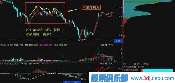 【操作技巧】繼續分析該股的走勢,可以看出該股形成了三重頂的形態(tài),在2011年的12月13日的時(shí)候,股價(jià)向下跌破了三重頂形態(tài)的頸線(xiàn)位置,出現了該股的第二個(gè)賣(mài)點(diǎn),投資者要仔細的分析股價(jià)走勢,把握賣(mài)出的時(shí)機。