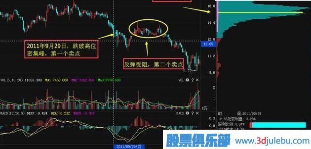 賣(mài)點(diǎn)1:9月29日,股價(jià)跌破前期高位密集峰,下跌的趨勢逐步形成,是股票賣(mài)出點(diǎn)的第一個(gè)位置;