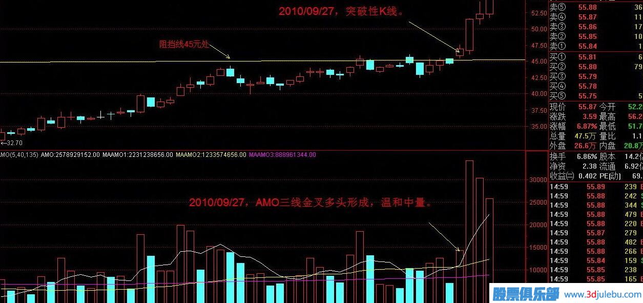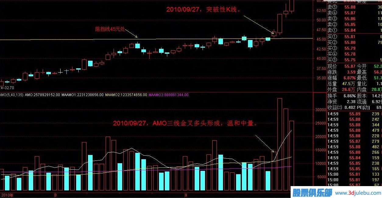 實(shí)例解析 600547,山東黃金。 2010/09/27,這天是滿(mǎn)足條件的標準的突破日,量AMO和價(jià)K,發(fā)生突破共振,操盤(pán)如此完美,可見(jiàn)主力不凡。阻擋線(xiàn)在45處。