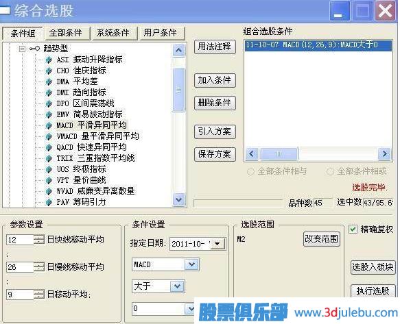 0,點(diǎn)“改變范圍”--“MACD選股”,選擇周期為“日線(xiàn)”,再點(diǎn)加入條 件,最后點(diǎn)選股入板塊,然后新建板塊名稱(chēng):“M1”,點(diǎn)確定,將日周期的MACD大于0的股票選入到M1板塊,目標縮小到52個(gè)股票。