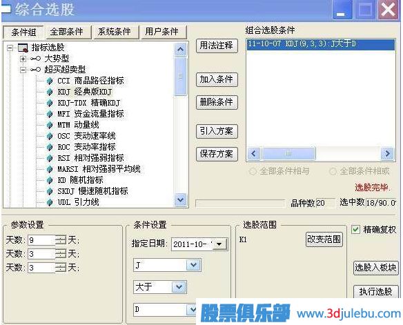D,點(diǎn)“改變范圍”--“M3”,選擇周期為“日線(xiàn)”,再點(diǎn)加入條件,最后點(diǎn) 選股入板塊,然后新建板塊名稱(chēng):“K1”,點(diǎn)確定,將日周期的KDJ的J大于D的股票選入到K1板塊,目標縮小到20個(gè)股票。