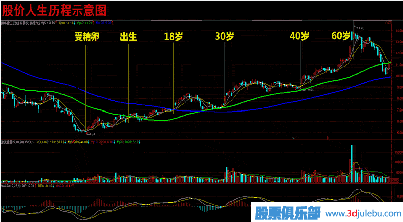 5、經(jīng)過(guò)第二波的上漲和調整后,股價(jià)迎來(lái)最后的瘋狂拉升,這時(shí)人氣極度旺盛,陽(yáng)氣十足,猶如40-60歲的成功人士一樣,在經(jīng)歷了幾十年的摸爬滾打后,此時(shí)人脈廣達、官運亨通、財富一方、所向披靡,整個(gè)人生走向巔峰。但伴之而來(lái)的是年紀的增大和體力的不支,全身各個(gè)器官不斷老化、衰竭。人生已至幕年,一生所創(chuàng )造的所有榮譽(yù)和輝煌都將伴隨著(zhù)生命的消失而灰飛煙滅。股價(jià)猶如流星般大幅下挫,開(kāi)始它新的輪回。