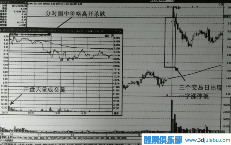 要點(diǎn)2:結合日K線(xiàn)圖中股價(jià)連續三日出現跳空上漲的一字漲停走勢,我們可以斷定,分時(shí)圖中天量高開(kāi)后回落情況已經(jīng)構成反轉形態(tài)。即便還未到收盤(pán),我們提前一步做空,都可以降低虧損。
