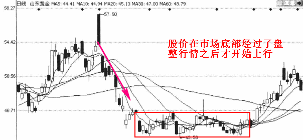 如下圖上凍黃金日K線(xiàn)圖,股價(jià)在市場(chǎng)底部經(jīng)過(guò)了盤(pán)整行情之后才開(kāi)始上行。