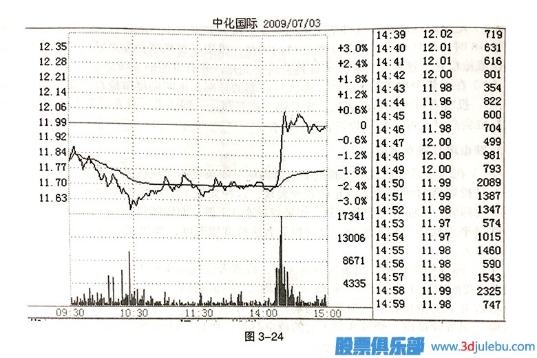 如圖3-24所示,中化國際(600500)主力在14:00之前讓股價(jià)維持窄幅震蕩,14.00之后,突然用大買(mǎi)單拉高股價(jià),直至拉到漲停。在股價(jià)快速拉高的過(guò)程中,成交量也出現了明顯放大,這說(shuō)明場(chǎng)外資金進(jìn)場(chǎng)比較明顯。如果在行情好的情況下出現這種走勢,第二天股價(jià)一般都會(huì )有一個(gè)沖高,對于短線(xiàn)投資者來(lái)說(shuō),可以在收盤(pán)前進(jìn)場(chǎng)買(mǎi)進(jìn)。如果第二天股價(jià)在沖高的過(guò)程中出現上漲無(wú)力的情況,可以獲利了結;如果第二天股價(jià)穩步上漲的話(huà),就可以繼續持有。