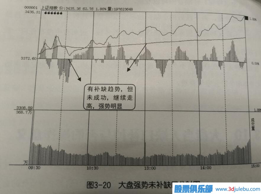 如圖3-20所示是大盤(pán)某天的分時(shí)走勢圖, 圖中顯示當天指數出現高開(kāi),在 十點(diǎn)過(guò)有明顯的一波回補缺口趨勢, 但最終并沒(méi)有補缺成功,指數再次上均線(xiàn), 隨后便單邊上揚走高根率較大, 正因為科能沒(méi)有成功說(shuō)明當天大盤(pán)走勢強勢,指數當天維續 因此當數科次上均線(xiàn)時(shí)就是入場(chǎng)時(shí)機,短線(xiàn)獲利根率非常大,