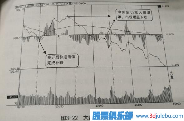 如圖3-22所示,大盤(pán)高開(kāi)回落回補缺口,盡管補缺后出現-波拉升,但最終仍然下跌。