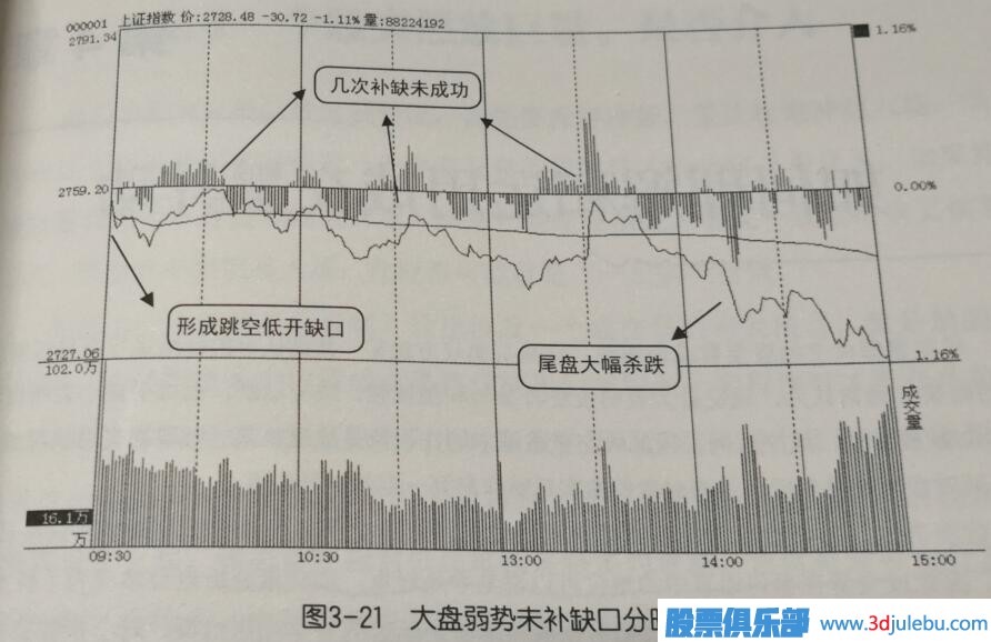 如圖3-21所示是大盤(pán)某天的分時(shí)走勢圖,圖中顯示當天大盤(pán)低開(kāi)后盤(pán)中有多次回補跳空缺口動(dòng)作, 但最終都