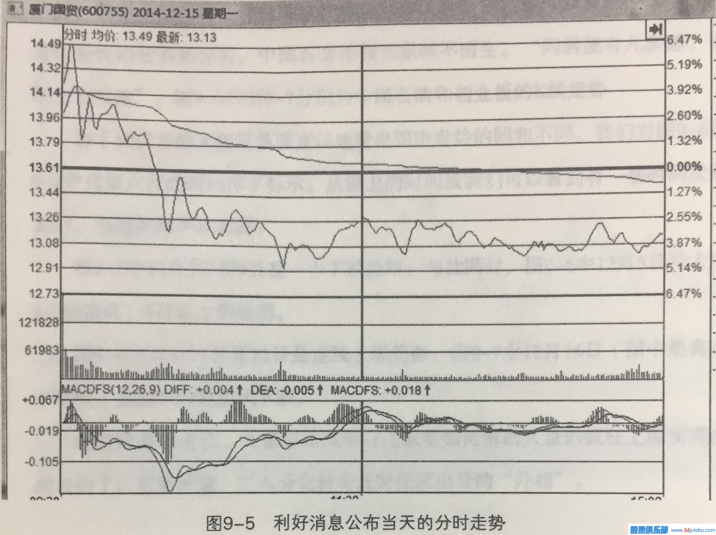 如圖9- -5所示,廈門(mén)國貿在消息公布當天,高開(kāi),直線(xiàn)拉升,就在無(wú)數股民蜂擁而上期待又一個(gè)漲停時(shí),股價(jià)急轉直下,全天維持在低位,振幅達12%。當天在高點(diǎn)時(shí)追進(jìn)的股民損失慘重。結合圖9-4中自貿區