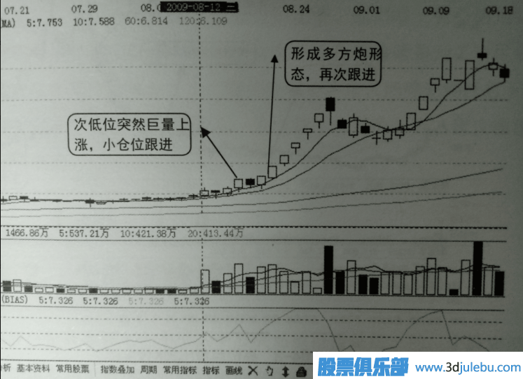 圖中顯示8月12日后的第二個(gè)交易日k線(xiàn)便形成多方炮格局(兩陽(yáng)夾一陰),再次跟進(jìn)是最明智的選擇,結果該股隨即出現連續漲停,十幾個(gè)交易日便實(shí)現股價(jià)翻番,由此可見(jiàn)次低位突然出現巨量拉升一定要引起足夠的重視,其中可能蘊含著(zhù)巨大的機會(huì )。