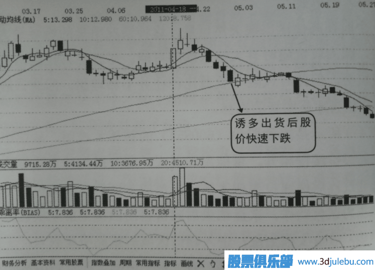 上面是莊家坐莊的整個(gè)過(guò)程,希望讀者能夠認真體會(huì ),深刻認識量能在分析莊家行為中的重要性。如圖4所示是該股頂部區域的放大圖,圖中清晰可見(jiàn)該股在2011年4月18日當天突然出現巨量拉升,股價(jià)似乎有二次走高的趨勢,第二天量能更是放大,出現明顯沖高回落走勢,隨后股價(jià)便出現連續大跌,該股從此進(jìn)入到散戶(hù)行情,股價(jià)一去不復返。