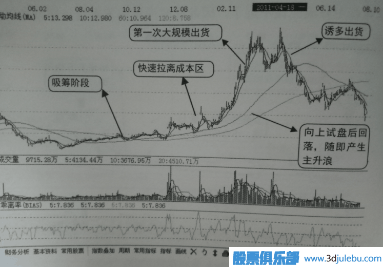 如圖3所示是海欣股份(600851) 的整體K線(xiàn)圖,從圖中可以看出,該股自底部起股價(jià)緩慢爬升,量能溫和放大,此階段為主力吸籌階段,隨后經(jīng)歷短暫的震倉過(guò)程后快速拉離成本區,拉離成本區后在次高位進(jìn)行橫盤(pán)震蕩并發(fā)生了一次主力試盤(pán)動(dòng)作,試盤(pán)結束后股價(jià)自由回落至前期橫盤(pán)震蕩區域,隨即產(chǎn)生主升浪,股價(jià)大幅上漲,進(jìn)入翻倍區域后量能明顯放大,主力進(jìn)行第一次大規模出貨,隨后股價(jià)明顯回落,為了將手中剩下的籌碼出貨殆盡,主力便設計了第二次拉高誘多出貨,也就是圖中所示的2011年4月18日位置,隨后股價(jià)便大幅下跌,從此一去不復返,主力出貨宣告成功,炒作告一段落。
