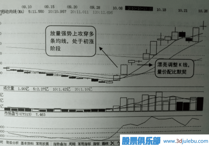 找好大盤(pán)的入場(chǎng)點(diǎn)后,我們來(lái)尋找板塊和個(gè)股,通過(guò)對當時(shí)暴漲期間的板塊和個(gè)股觀(guān)察發(fā)現,證券業(yè)板塊里的中信證券(600030) 滿(mǎn)足各項條件,首先其屬于大盤(pán)股,其次其上漲力度較大且處于開(kāi)漲階段,最重要的一點(diǎn)是此股回靠均線(xiàn)K線(xiàn)組合非常漂亮,量能配合也很默契,因此最終將此股作為追擊對象,追擊點(diǎn)定在此股回靠均線(xiàn)后繼續走強上穿120日均線(xiàn)的瞬間。