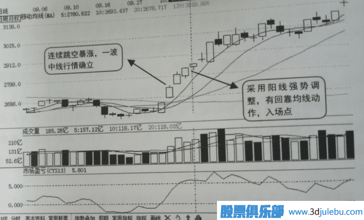 如圖1所示是大盤(pán)的日K線(xiàn)圖,圖中顯示大盤(pán)自底部連續跳空暴漲,氣勢如虹,頂尖高手會(huì )在暴漲之前就會(huì )有所潛伏,高手會(huì )在起漲當天介入,而一般的投資者往往會(huì )有點(diǎn)后知后覺(jué)初學(xué)者如何看盤(pán)及k線(xiàn)圖強調大盤(pán)暴漲個(gè)股如何才能追高買(mǎi)入,等反應過(guò)來(lái)是波中線(xiàn)行情時(shí) 也許大盤(pán)已經(jīng)上漲較多,大概就在連續跳空兩次拉出三根大陽(yáng)線(xiàn)之后,此時(shí)相信大多數人是不敢跟進(jìn)的,畢竟上漲幅度已經(jīng)有這么大,擔心大盤(pán)馬上會(huì )出現調整是人之常情,非常正常。