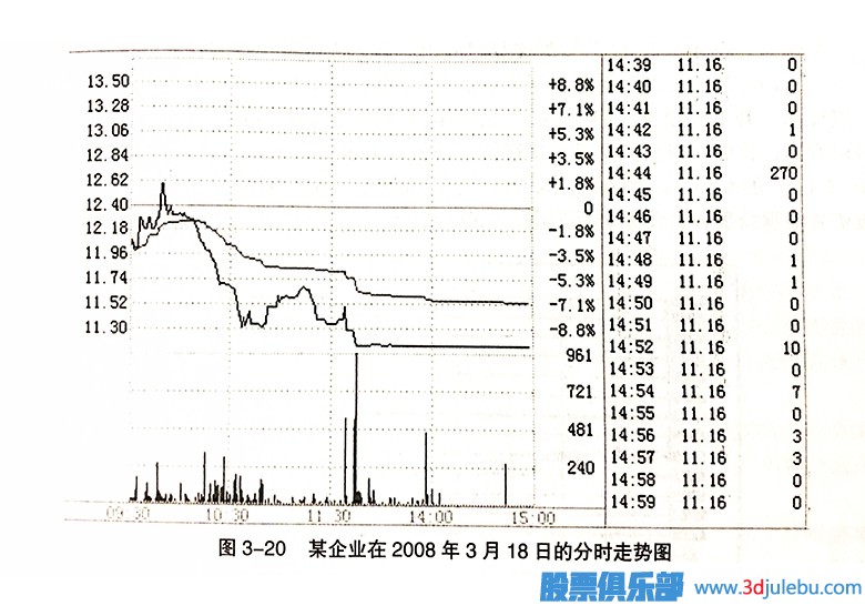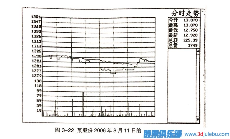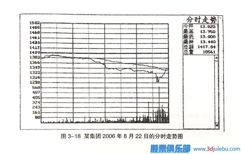 圖3-18是某集團2006年8月22日的分時(shí)走勢圖。從圖中可以看出,8月22日開(kāi)盤(pán)后,這只股票就開(kāi)始下跌,股價(jià)由開(kāi)盤(pán)時(shí)的13.82元,下跌到14:38的13.00元,跌去0.82元。14:40,一筆228手的成交阻止了股價(jià)下跌,14:42,這只股票又放出了591手的大成交量將股價(jià)提升到13.14元,隨后繼續放量,直到收盤(pán),股價(jià)最終被鎖定在13.49元的價(jià)位(見(jiàn)下表),這一現象表明這只股票尾市有主力掃盤(pán),后市有望漲升。事實(shí)也證明了這一點(diǎn),第二天,該股就止跌反彈;第三天,該股發(fā)力上揚,股價(jià)最高達到14.01元,當日收盤(pán)價(jià)為13.88元。按最高價(jià)計十算,該股的后市升幅達7.77%;按收盤(pán)價(jià)計十算,升幅也達6.77%,短線(xiàn)收益十分豐富。