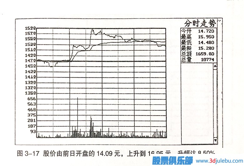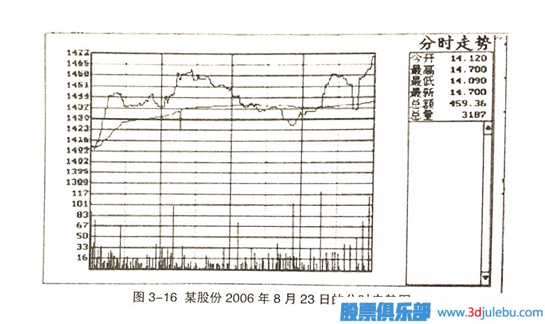 圖3-16是某股份2006年8月23日的分時(shí)走勢圖。在此之前,該股已從2006年4月日26.97元的高位下跌到2006年8月22日的14.09元,股價(jià)下跌了47.76%。2006年月23日,這只股票開(kāi)盤(pán)后仍慣性下跌,最低點(diǎn)跌到14.09元,因它下跌的幅度過(guò)大,下午開(kāi)盤(pán)后,盤(pán)中出現了三次放量走勢,第一次放量出現在13:54,每分鐘成交量為105手;第二次出現在14:17,每分鐘成交量為123手;第三次出現在14:57,每分鐘成交量為115手。這三次的每分鐘成交量,都比其他時(shí)間每分鐘的成交量多10倍以上。在成交量出現放量時(shí),該股股價(jià)也在小幅上升,特別是收盤(pán)前3分鐘的一筆成交量出現時(shí),股價(jià)猛升到14.65元,這預示著(zhù)后市這只股票的股價(jià)將會(huì )上漲。第二天,該股果然一路走紅,股價(jià)由前日開(kāi)盤(pán)的14.09元,上升到1695元,升幅達8.50%(見(jiàn)圖3-17)。這也證明股價(jià)經(jīng)過(guò)大跌后,如果第三篇每日實(shí)戰看盤(pán)要點(diǎn)—開(kāi)盤(pán)與收盤(pán)某一天尾市出現了成交量放