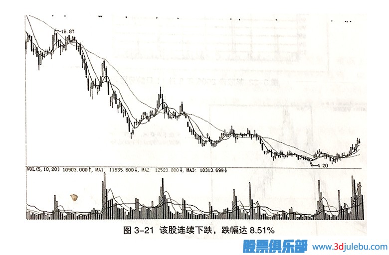 圖3-20是某企業(yè)在2008年3月18日的分時(shí)走勢圖。從圖中可看到,該股從當日10:30起成交量開(kāi)始萎縮,到收盤(pán)時(shí)平均的成交量只有不到20手,比再次之前的平均每分鐘手數大幅萎縮,股價(jià)也一度跌停,顯示出價(jià)跌縮量的走勢形態(tài)。從圖3-21中可以看出,在以后的幾個(gè)交易日中,該股繼續下跌,從1687元一度下跌到420元,跌幅達到75%,這就證明了“尾市縮量,股價(jià)下跌”的走勢是下跌信號,應該引起重視,千萬(wàn)不要在這個(gè)時(shí)候買(mǎi)進(jìn)股票。
