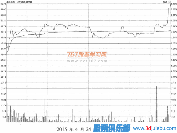 但是2015年4月24日浙江眾成的個(gè)股分時(shí)圖卻顯示,尾盤(pán)在急劇拉升(下圖),短短的9分鐘,由49.81元拉升至52.30元,幅度高達近5%,顯然是莊家通過(guò)隱性買(mǎi)賣(mài)盤(pán)在進(jìn)行拉升。莊家將大單化整為零,隱藏在無(wú)數個(gè)小單中。