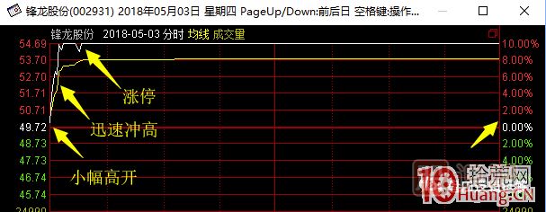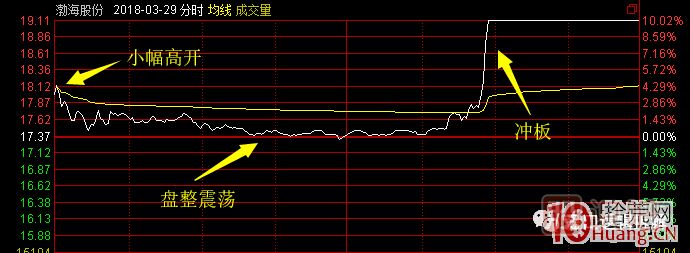 條件競價(jià)小幅高開(kāi)或平開(kāi)(低于3%),開(kāi)盤(pán)迅速沖高(5-10分鐘內股價(jià)突破7%),10:00前上板最佳,最好不要晚于10:30。這種分時(shí)圖整體是震蕩攀升格局。