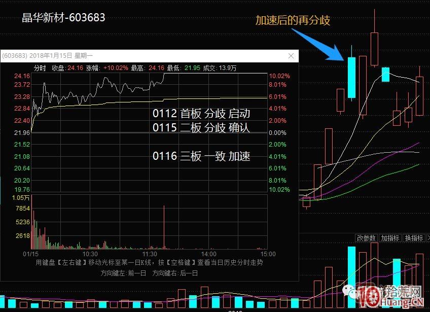 比如:創(chuàng )業(yè)板在01-22啟動(dòng)的時(shí)候,上海鋼聯(lián)已經(jīng)2連板了,從龍頭角度是放量2連板給予確認的,這個(gè)時(shí)候帶起的板塊。01-23的時(shí)候,上海鋼聯(lián)被頂一字,這就是集合已經(jīng)加速階段了,然后炸板,這就陷入分歧了。日內完成的一致(加速)-分歧,尾盤(pán)沒(méi)能回封。