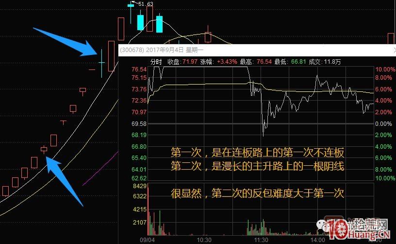 因為今天主要講的不是首陰,所以這里只是簡(jiǎn)單的穿插幾句。首陰,是個(gè)寬泛的詞,可以理解成連板票第一次出現陰線(xiàn)或者首次不連板,主要做的就是龍頭的最后一口氣。但是注意這里的陰線(xiàn)程度對反包是會(huì )有影響的,當然也有其他的各種因素疊加,但是大長(cháng)陰的反包明顯弱于小陰線(xiàn)。