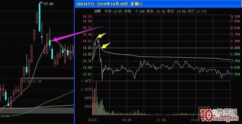 如青海華鼎。雖然K線(xiàn)沿著(zhù)10日線(xiàn)爬升,但分時(shí)表現顯弱,有沖高卻沒(méi)有沖板跡象,則日內找賣(mài)點(diǎn)。