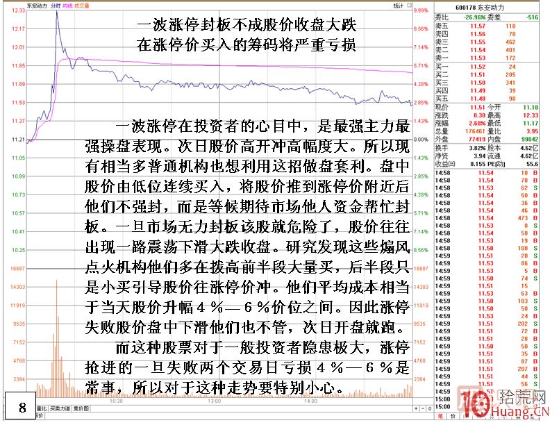所搶的個(gè)股不能封漲停有兩大風(fēng)險:第一,當天股價(jià)因不能封漲停出現明顯回落,當天就被套出現損失。第二,不能封漲停品種除了當天回落,大部分次日會(huì )出現低開(kāi)低走,損失進(jìn)一步擴大。