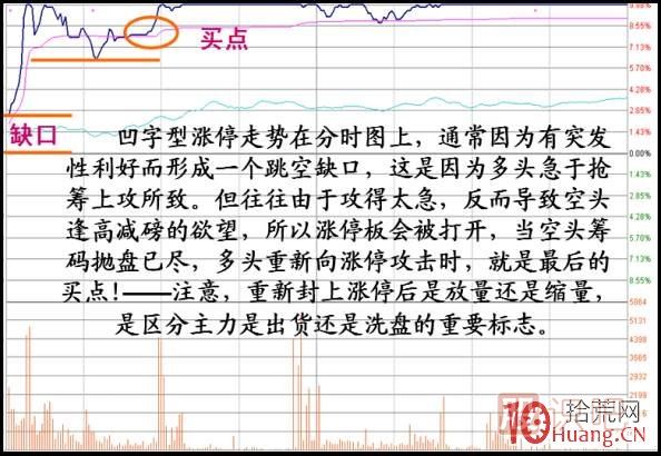 其實(shí)真正的買(mǎi)點(diǎn)只有一個(gè),就是在“凹”型的右下角——股價(jià)開(kāi)始出現向漲停板回升的路上,如圖中的圓圈所示。此時(shí)買(mǎi)入具有很好的確定性漲停的盤(pán)口語(yǔ)言,而“確定性”是我們短線(xiàn)操作最重要的的買(mǎi)入原則。