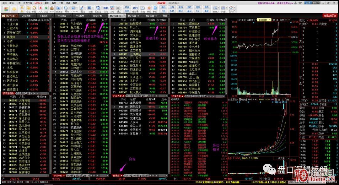 左三,左四,最上方都是漲跌幅排名搭配漲跌速,這個(gè)是用來(lái)看個(gè)股及時(shí)漲跌的,上升還是跳水。左三下面是自選股,當天想交易的票,左四下面是<短線(xiàn)精靈>,同花順一個(gè)指標,看漲跌停板和炸板方便。