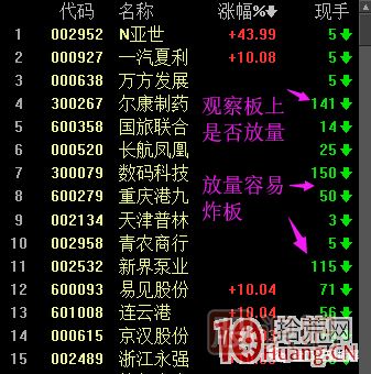 左二,市場(chǎng)漲跌幅排名,后面跟了一個(gè)<現手>功能(成交量)。注意了,這個(gè)功能很有用,漲幅排名和現手功能組合,盤(pán)中盯著(zhù)現手,成交量突然放大就是板上放量了,能提前知道有沒(méi)有炸板跡象。