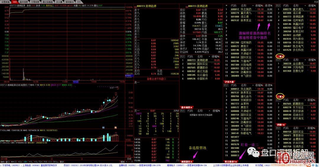 【漲幅+先手】,這個(gè)可以用來(lái)觀(guān)察漲停板的潛在炸板股,如果板上放量,就容易炸板了。(將鼠標放在窗口中間,然后左右移動(dòng)鍵盤(pán)的”←“,“→”就可以