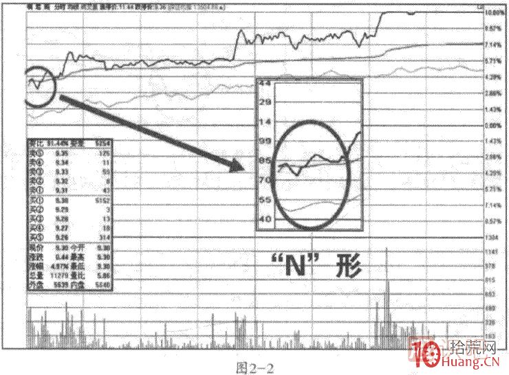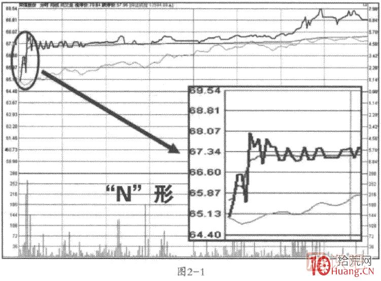 即開(kāi)盤(pán)后股價(jià)快速上沖后又快速回落,隨即又快速上沖,分時(shí)圖上呈現一個(gè)“N”形走勢——這說(shuō)明開(kāi)盤(pán)后股價(jià)遭遇拋壓,但隨即又被買(mǎi)盤(pán)托起,顯示多頭力道強大,當日看漲,見(jiàn)圖2-1.