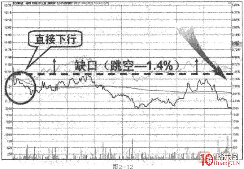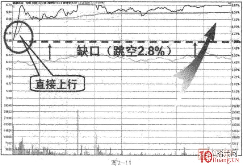 如果跳空開(kāi)盤(pán)后沒(méi)有任何回補動(dòng)作,那么全天的股價(jià)走勢必然會(huì )沿著(zhù)跳空的方向強力運行,請看圖2-11和圖2-12。